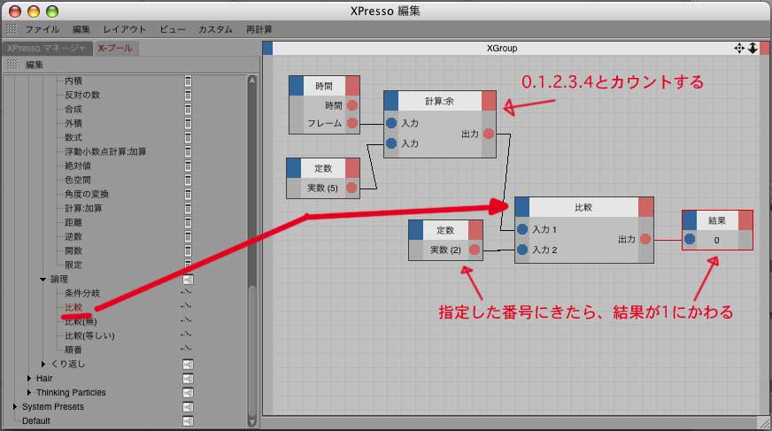 2.Xpressoに、ライトを入れ、右リストから、定数(3コ)、マップ変換、条件分岐をドラッグする