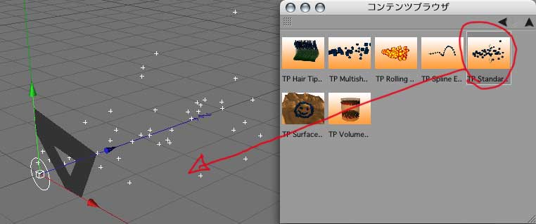 コンテンツブラウザ>Thinking Particles>Emitter>TP Standard Emitterをドラッグでおわり