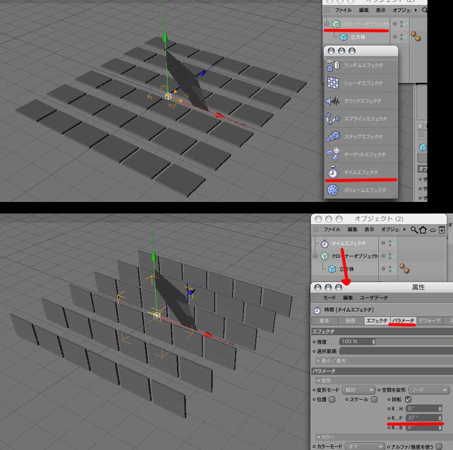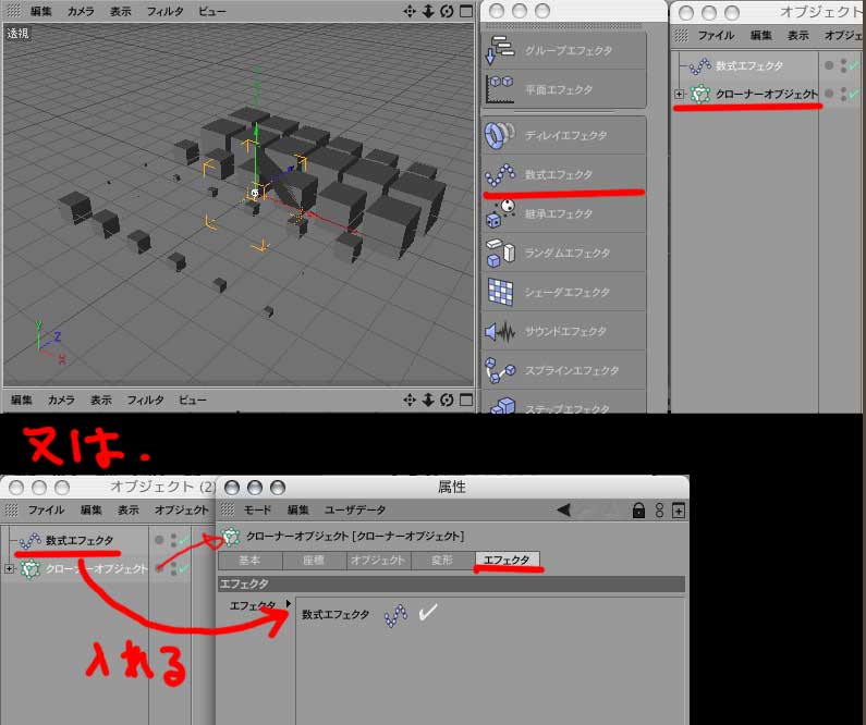 パーティクルの有線 >エフェクタの後(これをしないとエフェクタがかからない)