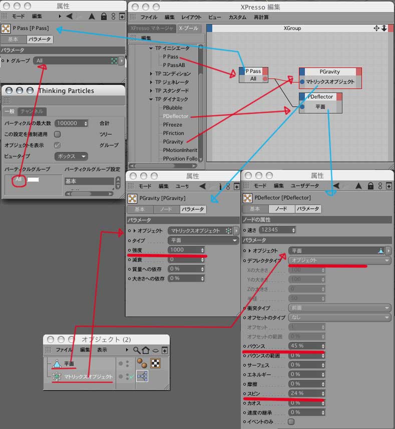 3.シンキングパーティクルのリストから、Pパス、pデフレクタ、Pグラビティーをドラッグします