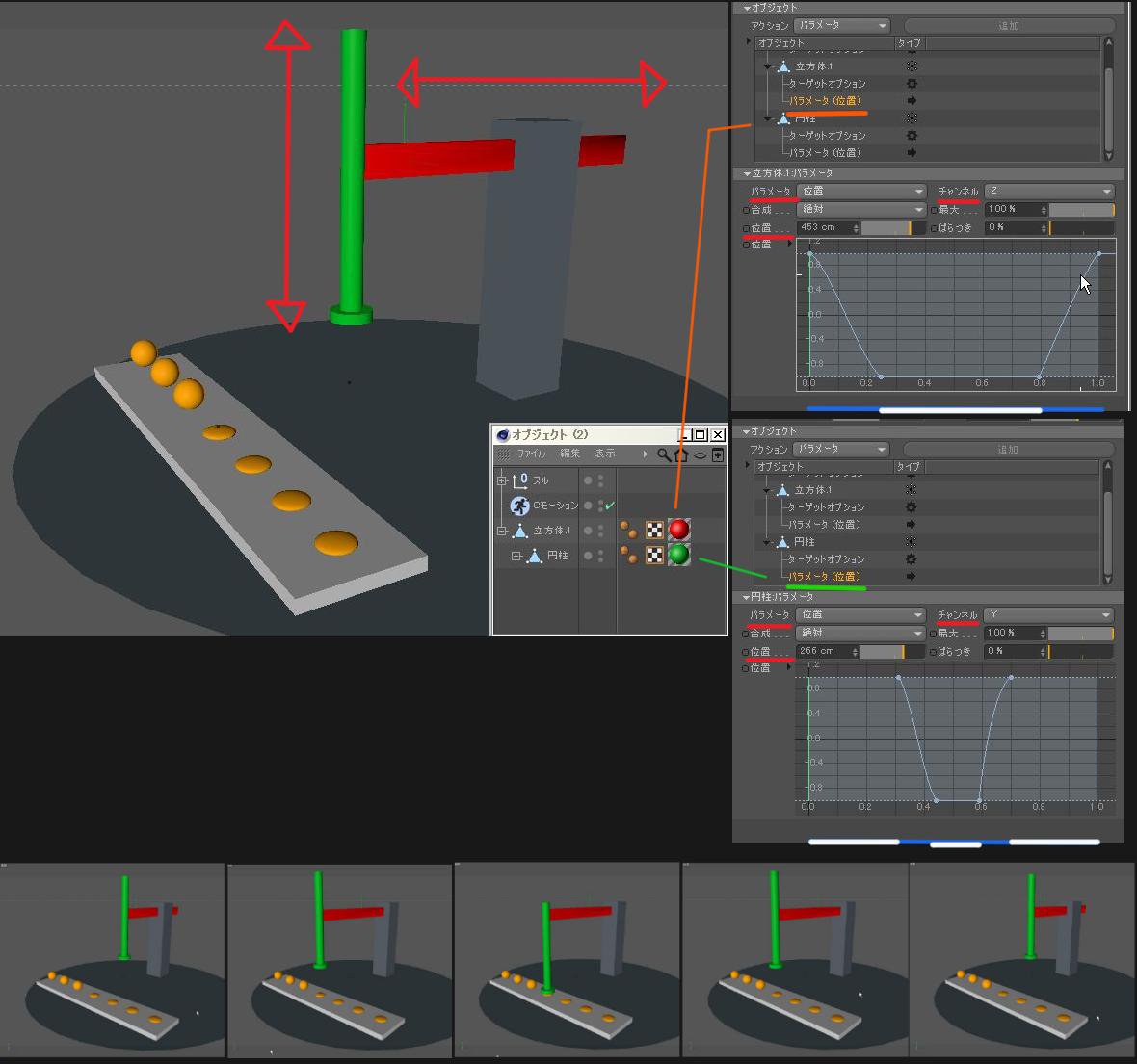 1:2つのオブジェクト(赤、緑)をCモーションに入れる