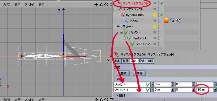 マッスルオブジェクトの設定にボーンをドラッグして、200mを10mにして長さを合わせます。