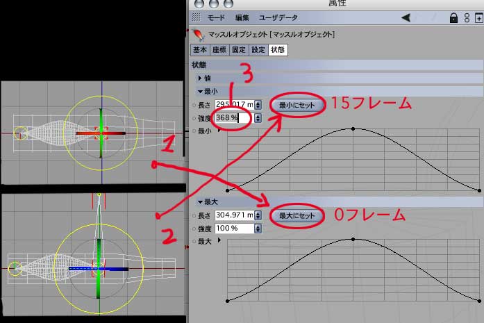1. 1フレームにして,腕をのばした状態で”最大にセット”をクリック