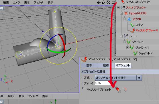 そして。マッスルデフォーマー設定の中にマッスルオブジェクトを入れます