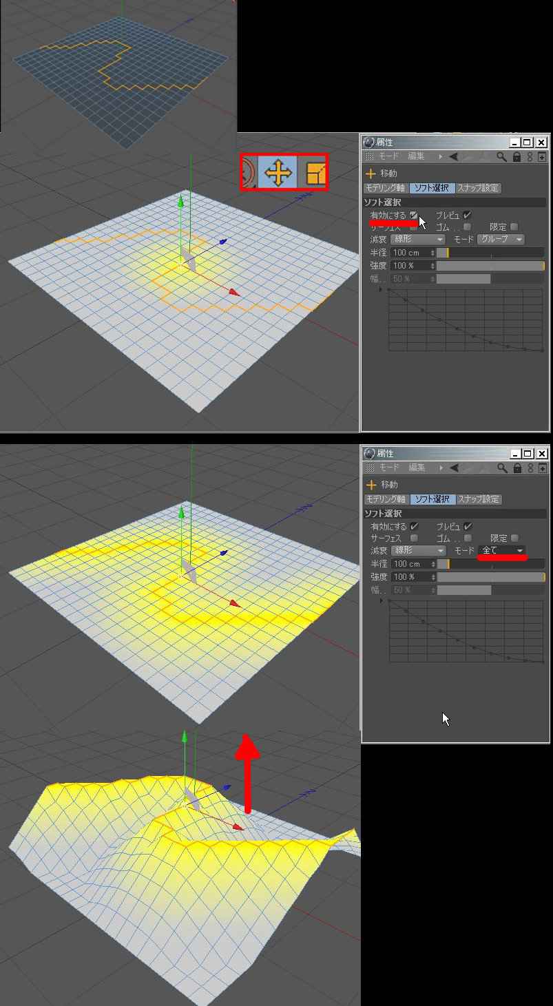 4.そして通常のように移動すると黄色の範囲が盛り上がるようになる
